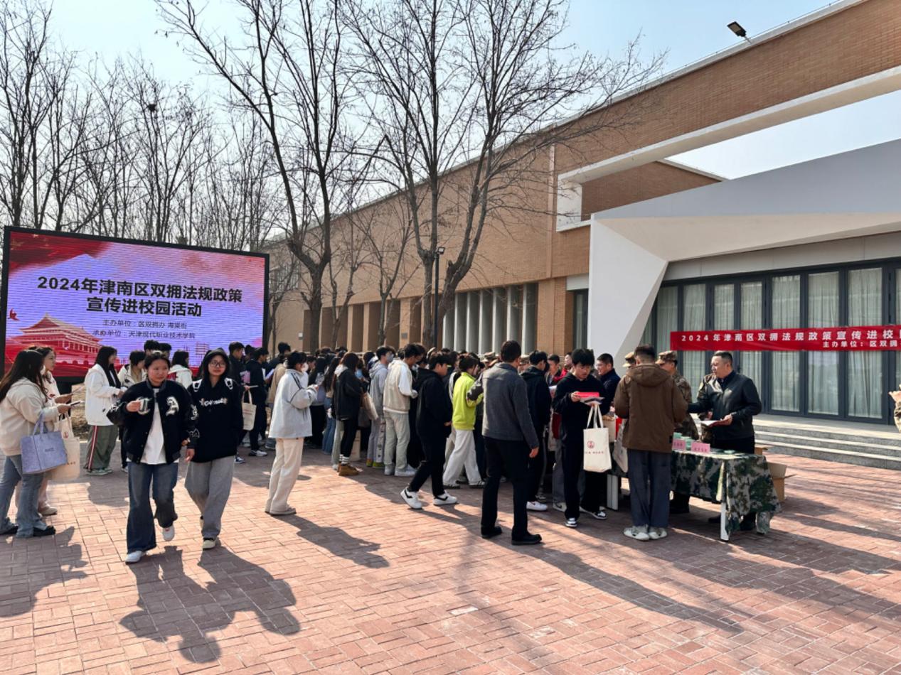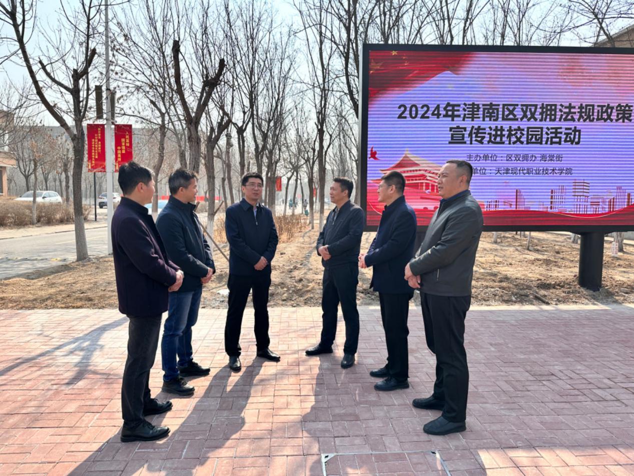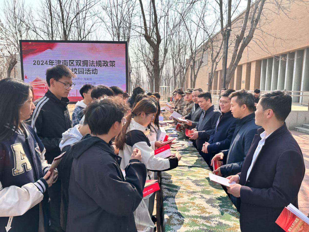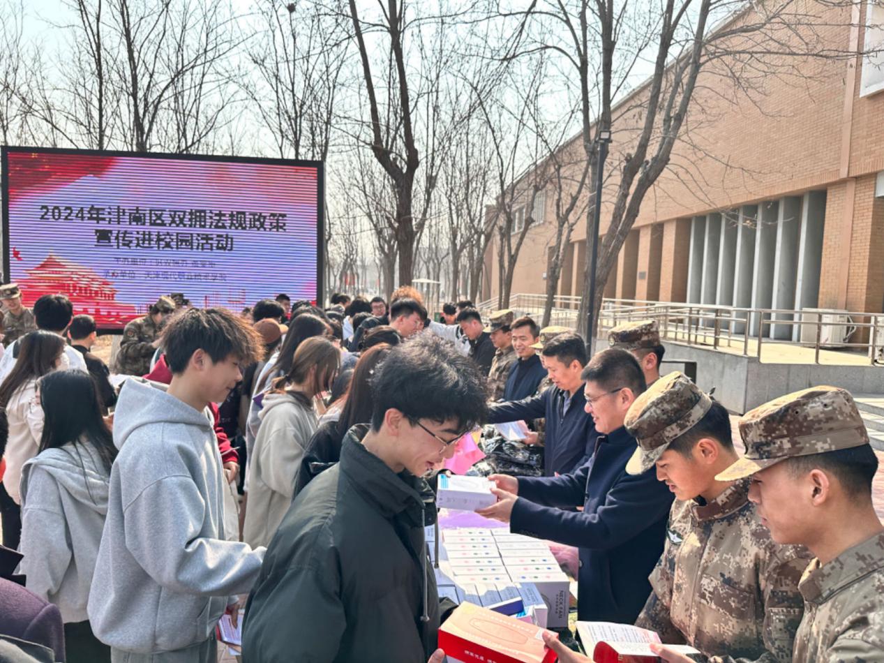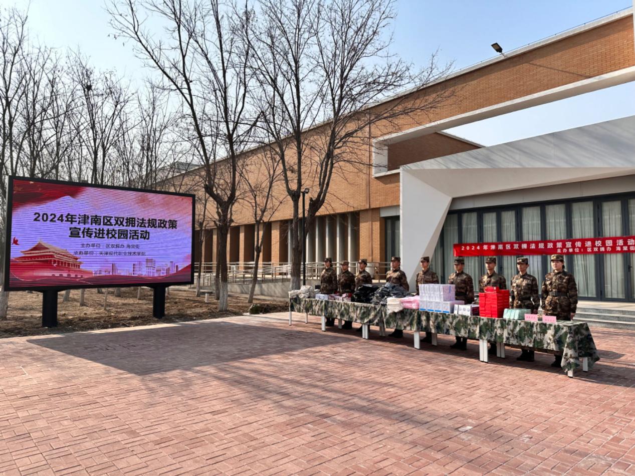 为深入贯彻落实习近平总书记关于双拥工作和加强全民国防教育的重要指示批示精神,大力营造全院师生关心关注国防和双拥建设、重视支持和参与双拥工作的良好氛围,3月14日,学院联合津南区双拥办、津南区退役军人服务中心和海棠街军人服务站在“一站式学生社区”综合服务中心广场,共同举办了“2024年津南区双拥法规政策宣传进校园活动”。党委副书记程非凡出席活动并与区双拥办、区退役军人服务中心和海棠街退役军人服务站进行深入交流。