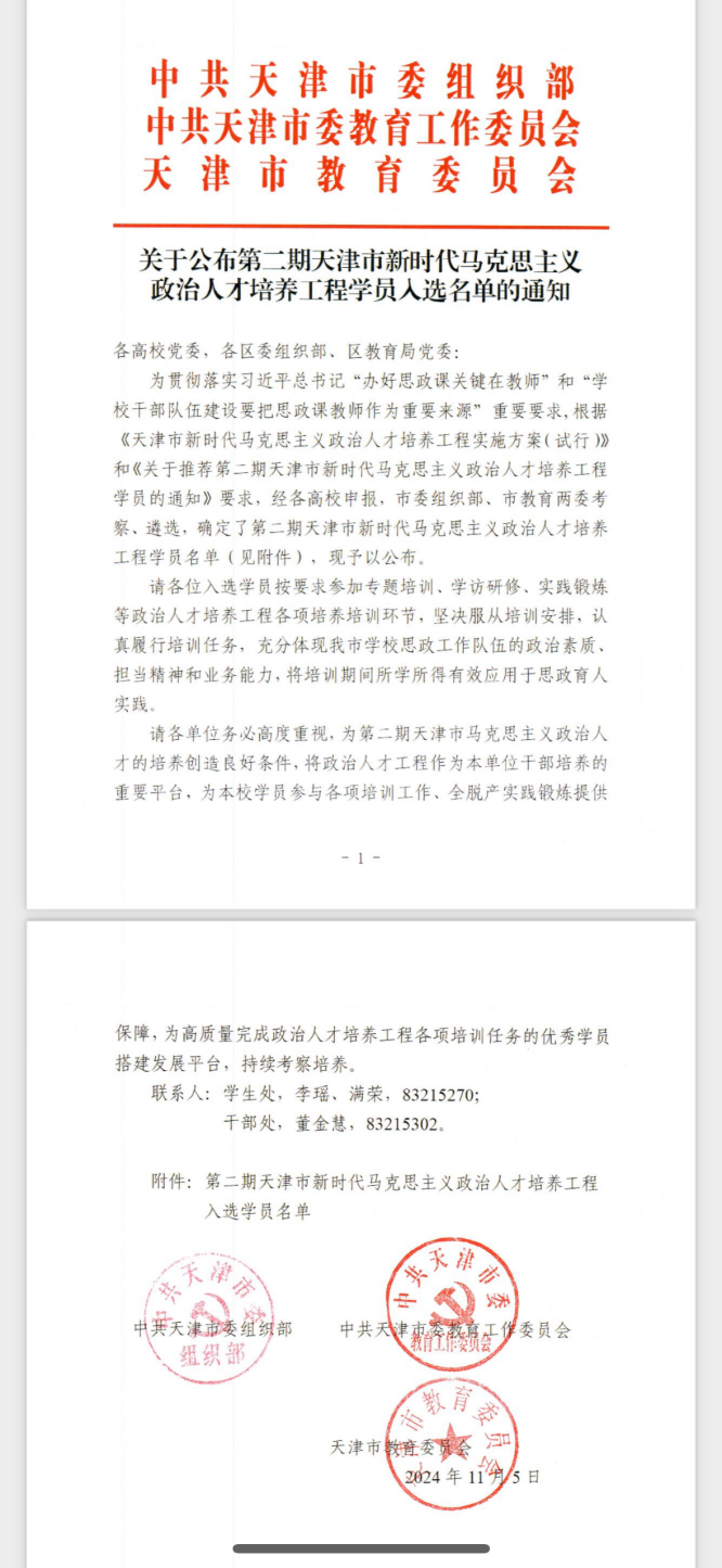 近日,第二期天津市新时代马克思主义政治人才培养工程学员入选名单公布,我校思政课教师张咏成功入选。