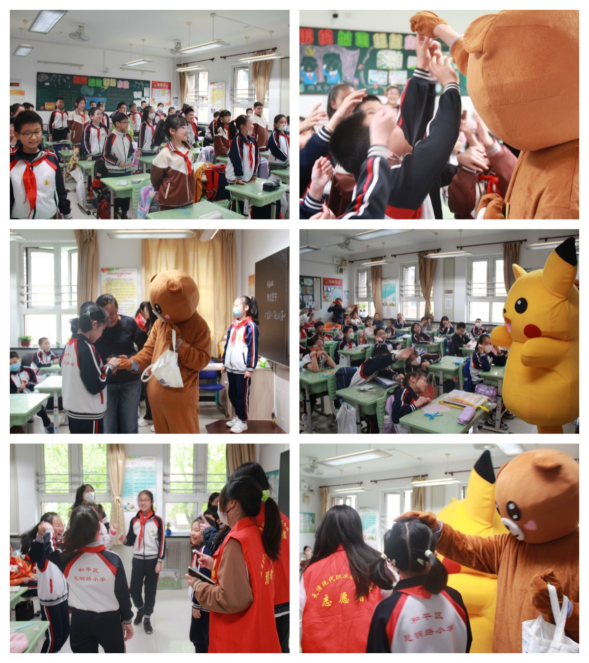 活动现场,志愿者扮成玩偶分别走进7个班级与小学生们亲密互动,随后与指导老师赵辰欣分别带领昆明路小学的同学们进行了“手臂测量”、“小蜜蜂”、“老师说‘起立’”、“解开千千结”、“激情节拍”等团体活动,并与小学生们积极互动交流,分发自制的羊毛毡礼品。小学生们也各显其能为志愿者们展示舞蹈,唱歌等才艺,和大家亲切合影。