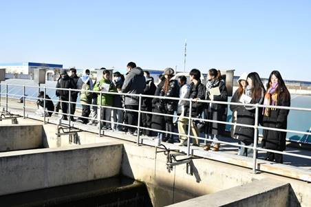 天津市津沽路污水处理厂研学过程中,污水处理厂陈工在中央控制室为同学们全方位讲解了污水处理厂的工艺流程以及扩建项目,带领师生实地参观生物池、二沉池、反硝化滤池工艺流程、高效沉淀池、超滤膜池等主要工艺流程,详细讲解处理厂用到的全过程除臭工艺、紫外线消毒工艺、多级AO+高效沉淀+深床过滤工艺。
