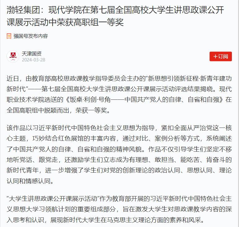 近日,由教育部高校思政课教学指导委员会主办的“新思想引领新征程·新青年建功新时代”——第七届全国高校大学生讲思政课公开课展示活动评选结果揭晓。现代职业技术学院选送的《饭桌·利剑·号角——中国共产党人的自律、自省和自强》在全国高职组中脱颖而出,荣获一等奖。