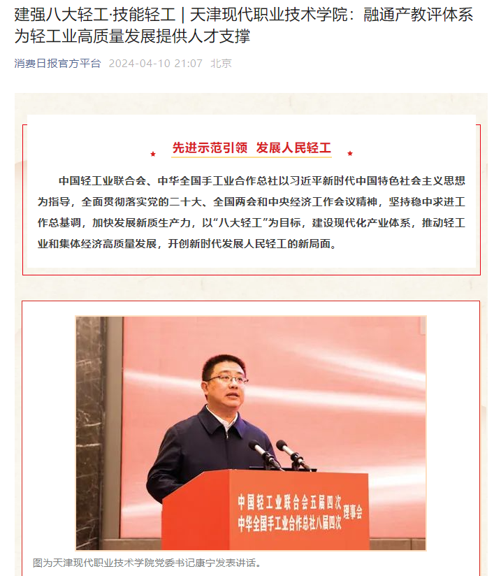 “聚焦行业人才需求,打造多元协作育人共同体。”在4月8日召开的中国轻工业联合会五届四次、中华全国手工业合作总社八届四次理事会上,康宁介绍了学院在产教融合和高技能人才培养方面的经验,学院针对行业企业需求,秉承“共建、共享、共赢”的原则,围绕精密制造、食品医药等6个专业群,分别与天津海鸥、梅花生物等知名企业共建产业学院,携手政府、行业、企业在职业教育新基建中共同打造金专业、金课程、金师资、金实训和金教材。