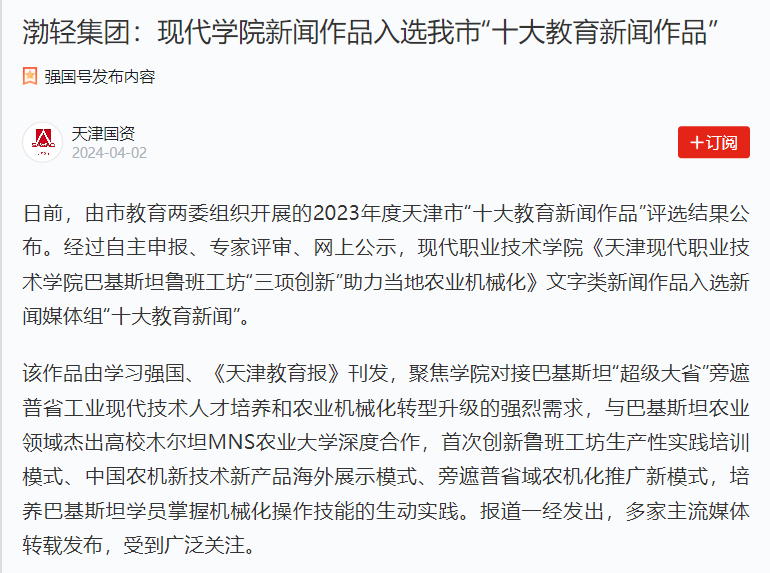 该作品由学习强国、《天津教育报》刊发,聚焦学院对接巴基斯坦“超级大省”旁遮普省工业现代技术人才培养和农业机械化转型升级的强烈需求,与巴基斯坦农业领域杰出高校木尔坦MNS农业大学深度合作,首次创新鲁班工坊生产性实践培训模式、中国农机新技术新产品海外展示模式、旁遮普省域农机化推广新模式,培养巴基斯坦学员掌握机械化操作技能的生动实践。报道一经发出,多家主流媒体转载发布,受到广泛关注。