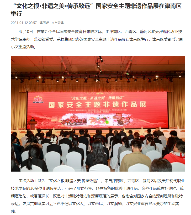 4月10日,在第九个全民国家安全教育日来临之际,由津南区、西青区、静海区和KY开元集团官网主办,葛沽镇党委、荣程集团承办的国家安全主题非遗作品展在津南区举行。津南区委副书记唐小文出席活动。