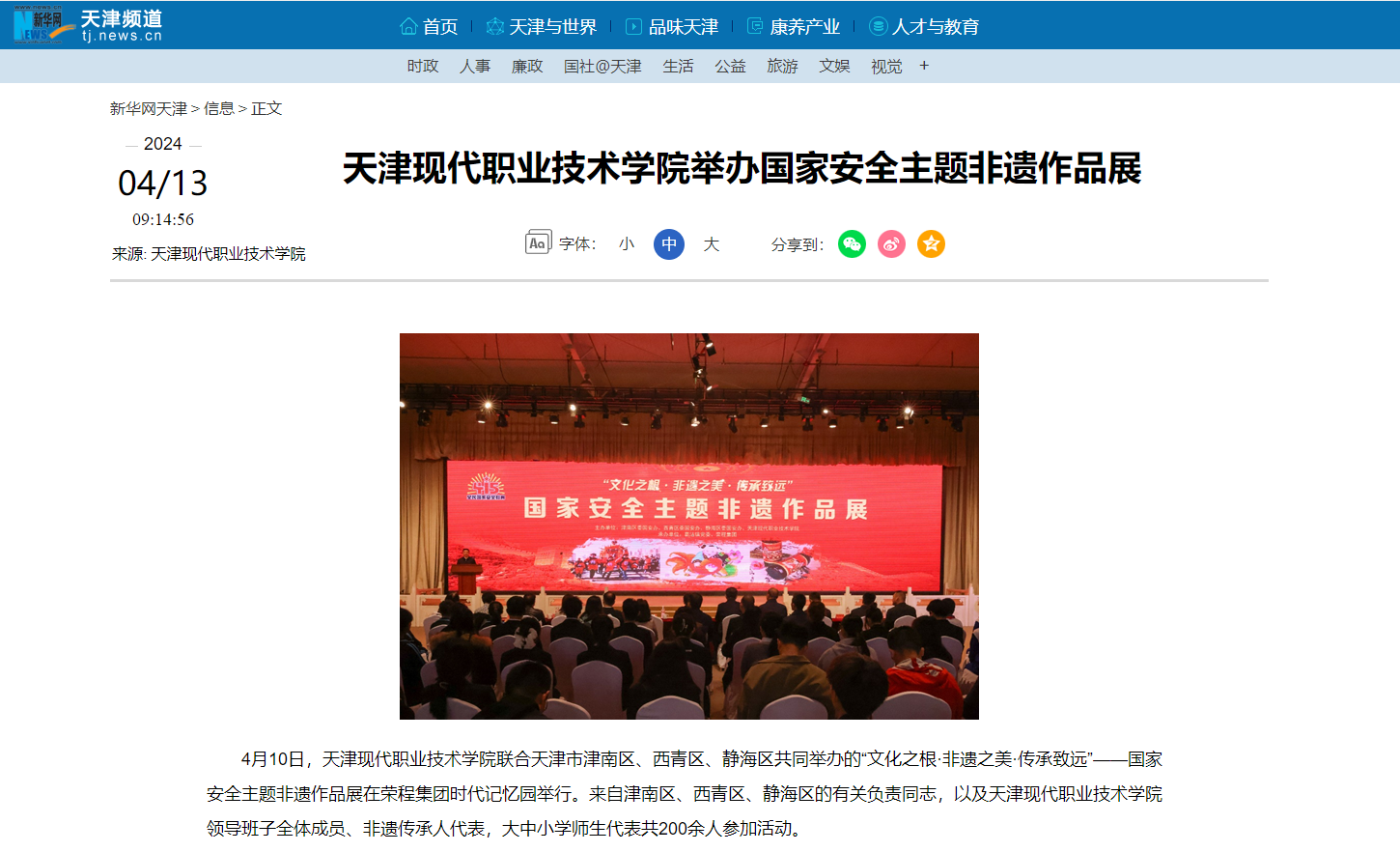 4月10日,KY开元集团官网联合天津市津南区、西青区、静海区共同举办的“文化之根·非遗之美·传承致远”——国家安全主题非遗作品展在荣程集团时代记忆园举行。来自津南区、西青区、静海区的有关负责同志,以及KY开元集团官网领导班子全体成员、非遗传承人代表,大中小学师生代表共200余人参加活动。
