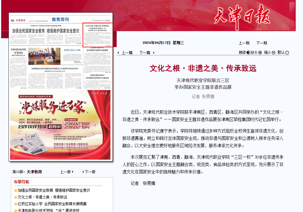 本次展览汇聚了津南、西青、静海、天津现代职业学院“三区一校”30余位非遗传承人的匠心之作,以国家安全主题融合类、观览类、食品体验类的方式呈现,充分展示了非遗文化在国家安全中的独特魅力和传承价值。