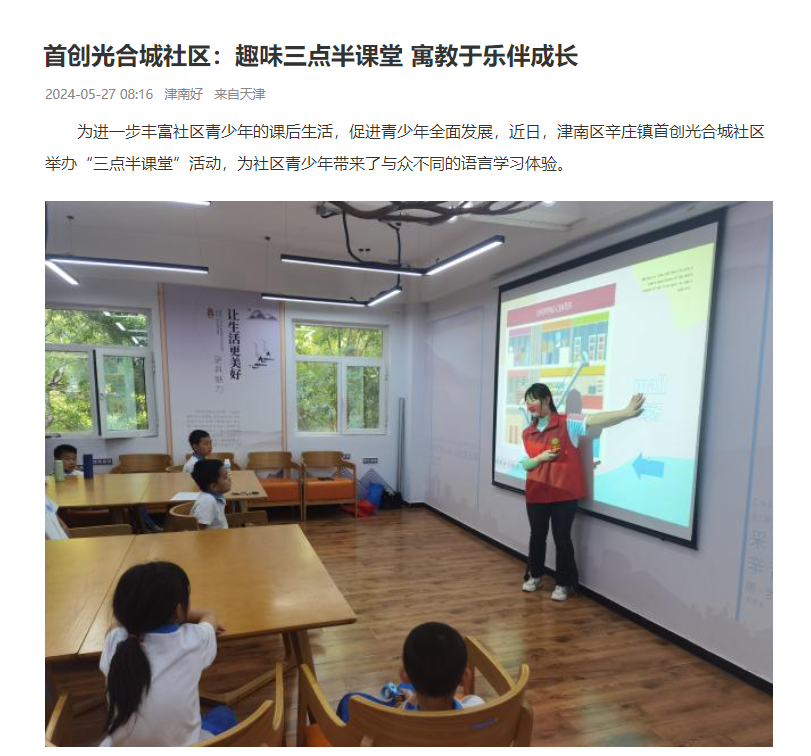 为进一步丰富社区青少年的课后生活,促进青少年全面发展,近日,津南区辛庄镇首创光合城社区举办“三点半课堂”活动,为社区青少年带来了与众不同的语言学习体验。