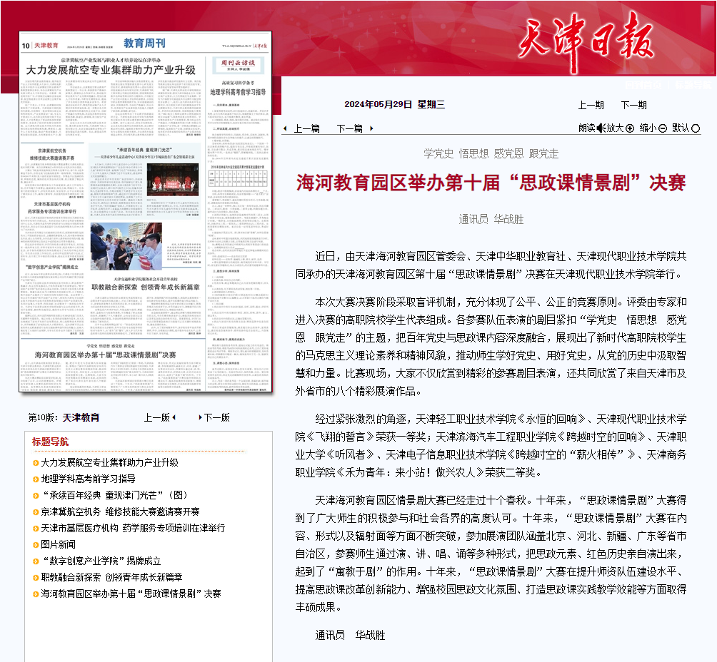 近日,由天津海河教育园区管委会、天津中华职业教育社、KY开元集团官网共同承办的天津海河教育园区第十届“思政课情景剧”决赛在KY开元集团官网举行。