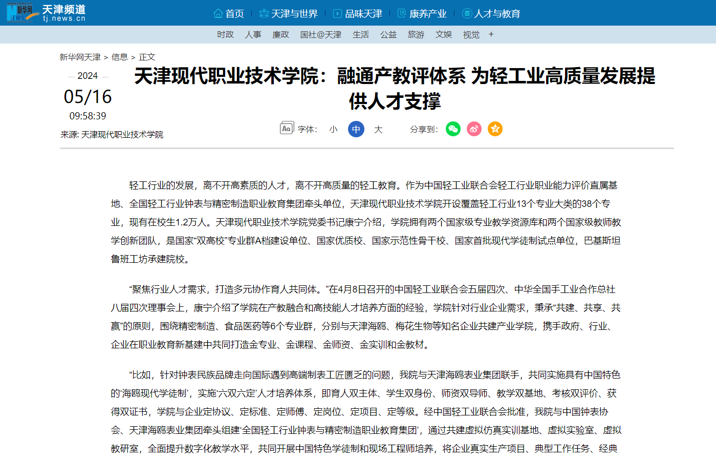 “比如,针对钟表民族品牌走向国际遇到高端制表工匠匮乏的问题,我院与天津海鸥表业集团联手,共同实施具有中国特色的‘海鸥现代学徒制’,实施‘六双六定’人才培养体系,即育人双主体、学生双身份、师资双导师、教学双基地、考核双评价、获得双证书,学院与企业定协议、定标准、定师傅、定岗位、定项目、定等级。经中国轻工业联合会批准,我院与中国钟表协会、天津海鸥表业集团牵头组建‘全国轻工行业钟表与精密制造职业教育集团’,通过共建虚拟仿真实训基地、虚拟实验室、虚拟教研室,全面提升数字化教学水平,共同开展中国特色学徒制和现场工程师培养,将企业真实生产项目、典型工作任务、经典案例等打造为紧跟轻工产业发展的教学资源、课程标准、考核标准、实训标准,促进教育链、人才链与产业链、创新链紧密结合。”康宁说,在去年的第二届全国职业技能大赛上,学院荣获2枚金牌、1枚铜牌和1个优胜奖。赵跃武老师在中国轻工业联合会举办的全国机械手表维修工职业技能竞赛中荣获二等奖,被授予“全国轻工技术能手”称号。