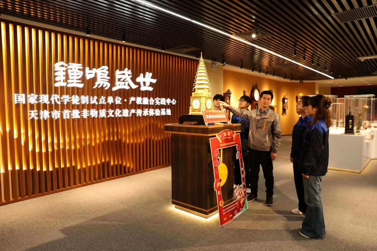 在“钟鸣盛世”天津市首批非物质文化遗产传承体验基地,天津市清代古钟表非遗传承人李秋生大师,正带领学生进行清代宫廷钟表修复与制作技艺的学习。这里近40件珍贵展品都是钟表艺术的瑰宝,学生们不仅学习到修复古钟表的技艺,更深刻体会到了钟表中蕴含的中华优秀传统文化。