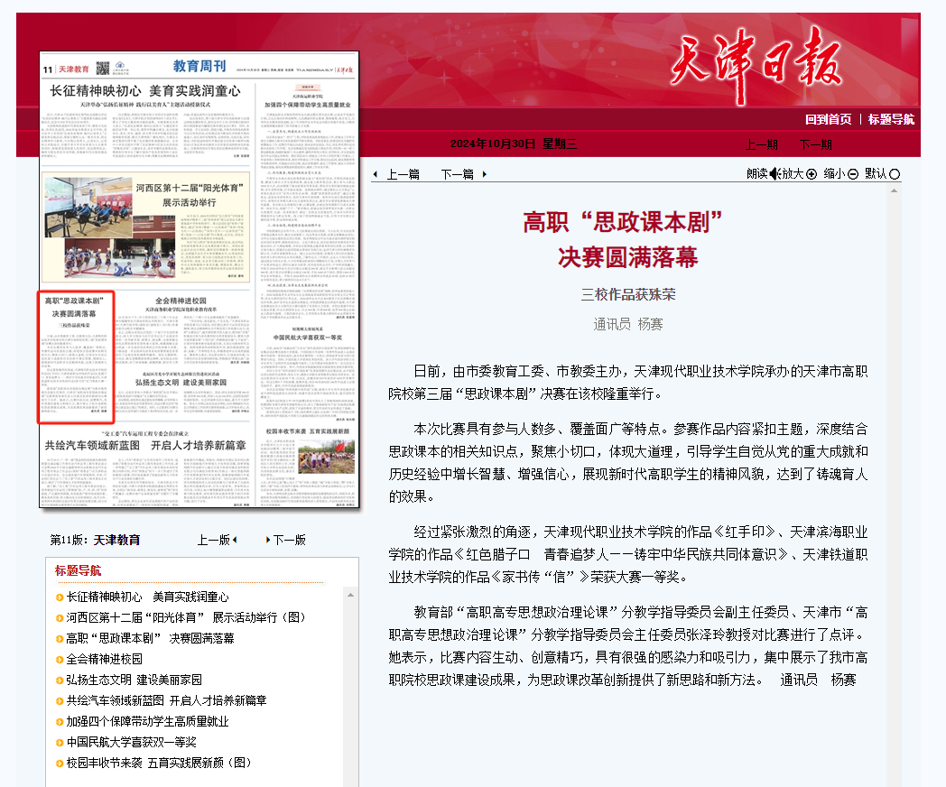 日前,由市委教育工委、市教委主办,KY开元集团官网承办的天津市高职院校第三届“思政课本剧”决赛在该校隆重举行。