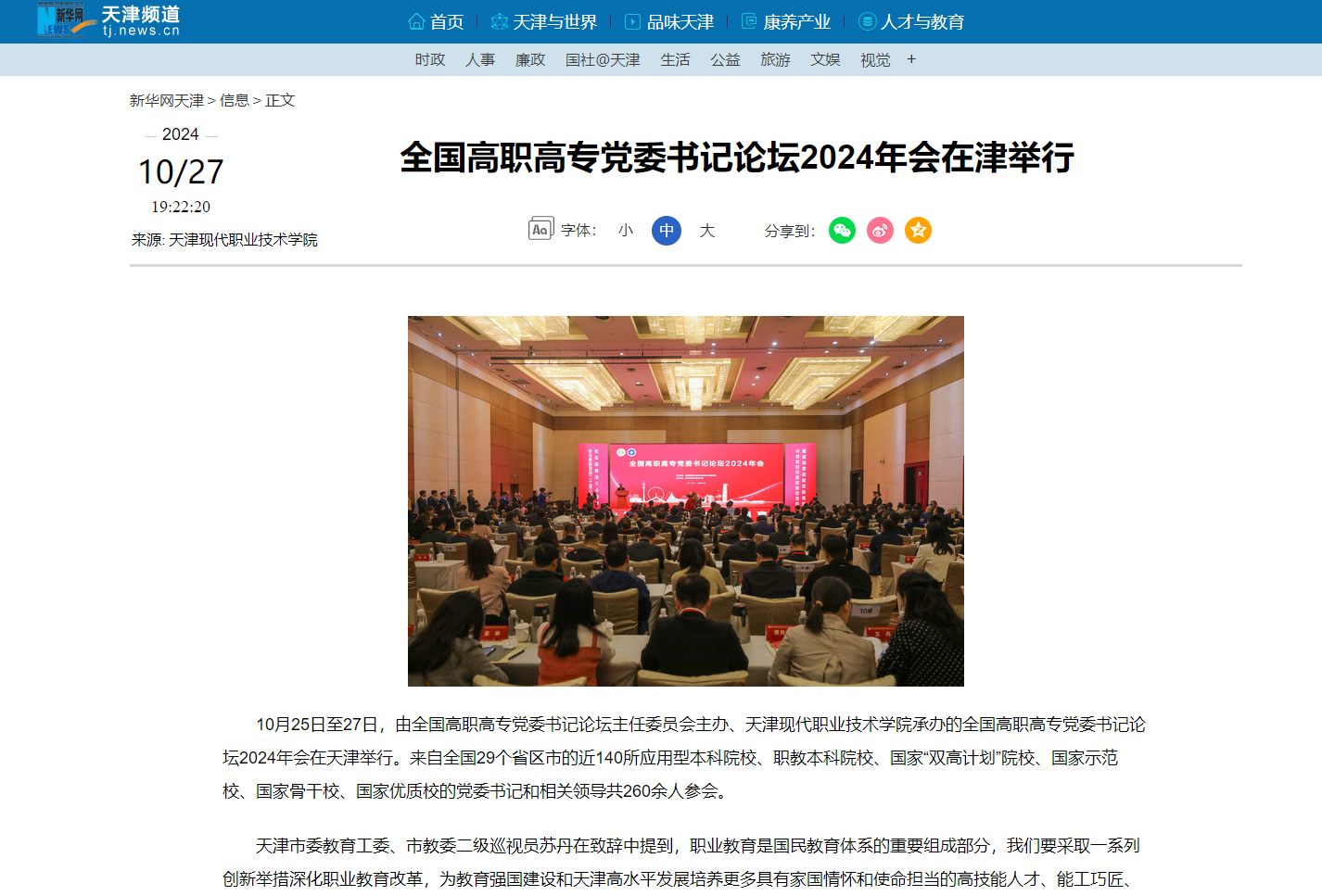 10月25日至27日,由全国高职高专党委书记论坛主任委员会主办、KY开元集团官网承办的全国高职高专党委书记论坛2024年会在天津举行。来自全国29个省区市的近140所应用型本科院校、职教本科院校、国家“双高计划”院校、国家示范校、国家骨干校、国家优质校的党委书记和相关领导共260余人参会。