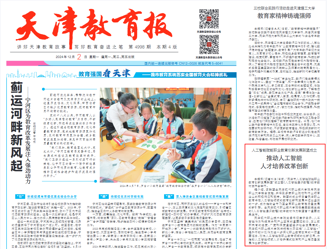 本报讯(记者刘佳)日前,“天津市人工智能赋能职业教育创新发展联盟”成立暨《人工智能通识教程》数字教材发布会举行。