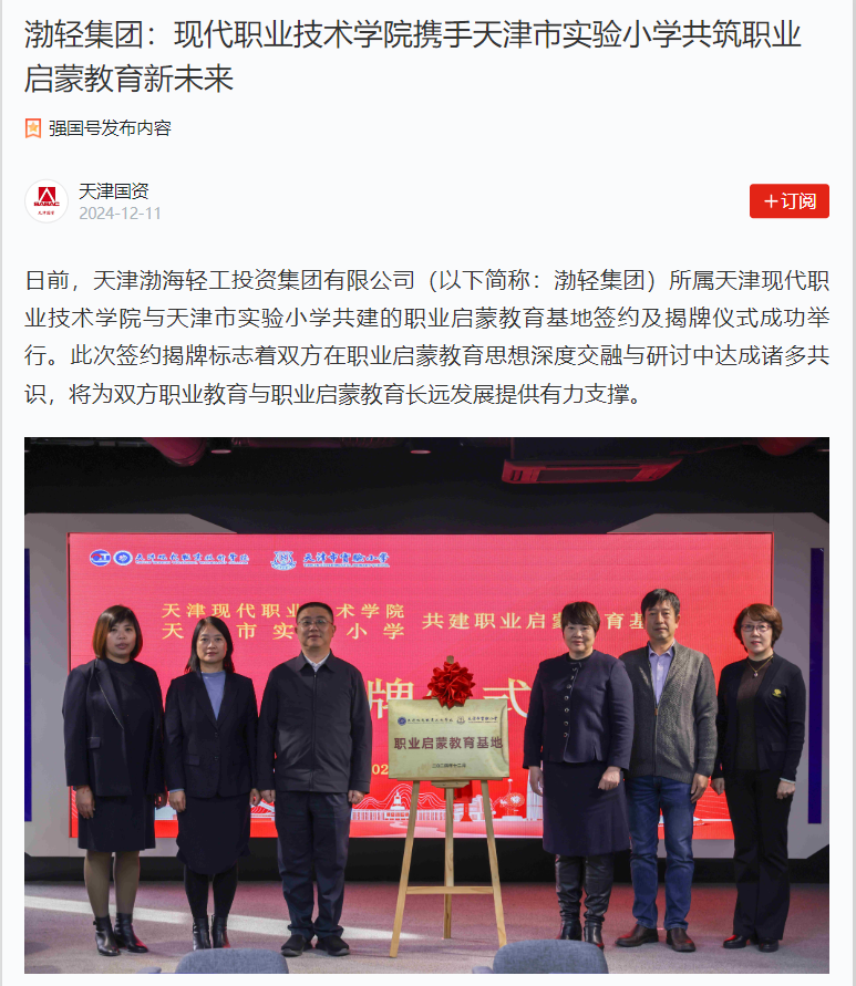 日前,天津渤海轻工投资集团有限公司(以下简称:渤轻集团)所属KY开元集团官网与天津市实验小学共建的职业启蒙教育基地签约及揭牌仪式成功举行。此次签约揭牌标志着双方在职业启蒙教育思想深度交融与研讨中达成诸多共识,将为双方职业教育与职业启蒙教育长远发展提供有力支撑。