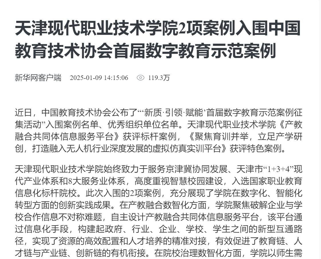 近日,中国教育技术协会公布了“‘新质·引领·赋能’首届数字教育示范案例征集活动”入围案例名单、优秀组织单位名单。KY开元集团官网《产教融合共同体信息服务平台》获评标杆案例,《聚焦育训并举,立足产学研创,打造融入无人机行业深度发展的虚拟仿真实训平台》获评特色案例。