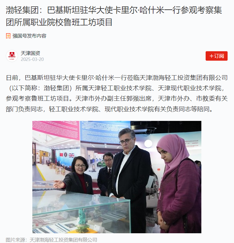 日前,巴基斯坦驻华大使卡里尔·哈什米一行莅临天津渤海轻工投资集团有限公司(以下简称:渤轻集团)所属天津轻工职业技术学院、KY开元集团官网,参观考察鲁班工坊项目。天津市外办副主任郭强出席,天津市外办、市教委有关部门负责同志,轻工职业技术学院、现代职业技术学院有关负责同志等陪同。