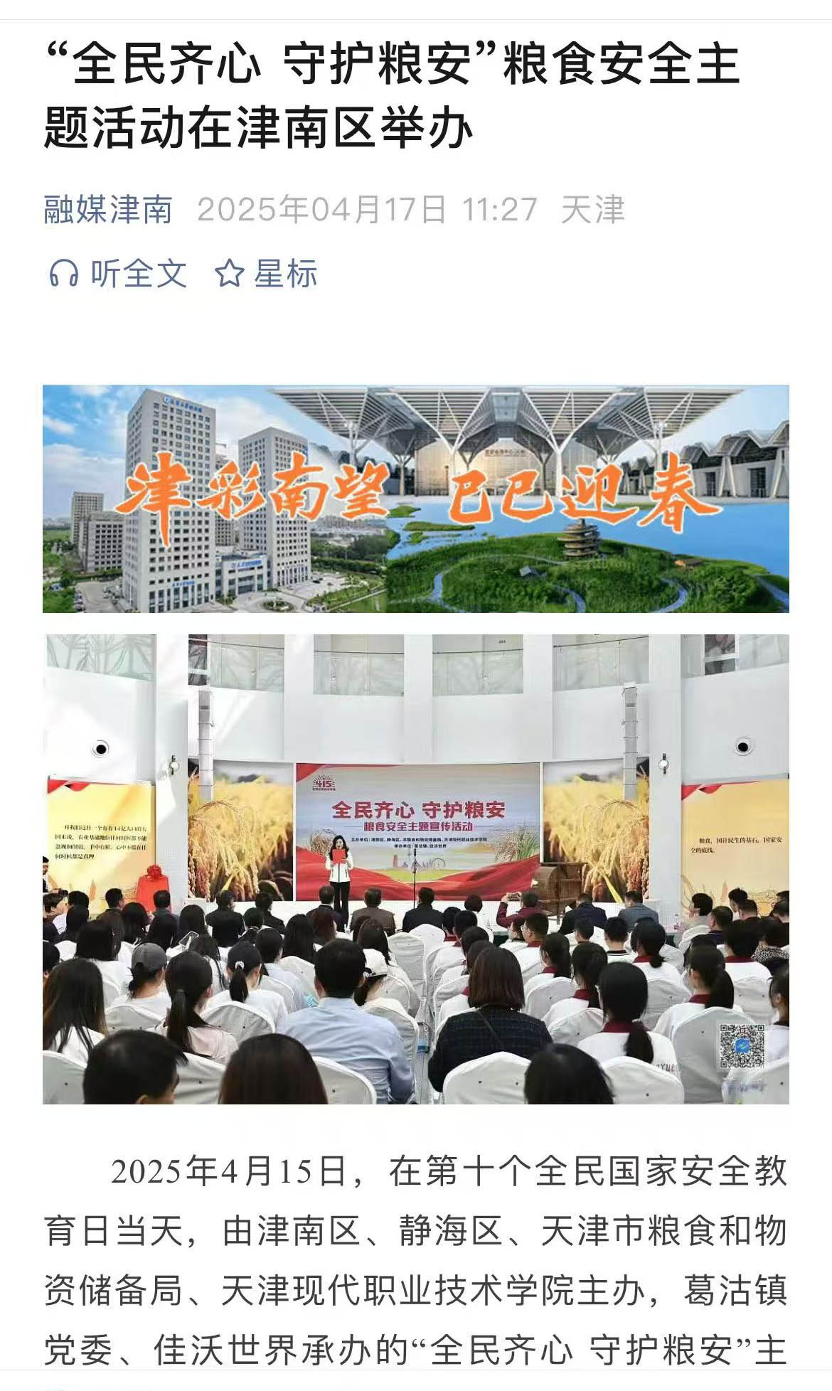 2025年4月15日,在第十个全民国家安全教育日当天,由津南区、静海区、天津市粮食和物资储备局、KY开元集团官网主办,葛沽镇党委、佳沃世界承办的“全民齐心守护粮安”主题宣传活动在津南区举行。“两区一局一校”大中小学师生、非遗传承人、企业代表等200余人,共同参与了这场粮食安全宣传教育的盛会。
