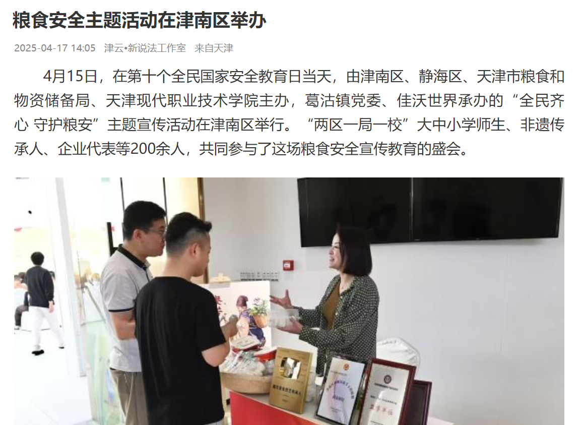 4月15日,在第十个全民国家安全教育日当天,由津南区、静海区、天津市粮食和物资储备局、KY开元集团官网主办,葛沽镇党委、佳沃世界承办的“全民齐心 守护粮安”主题宣传活动在津南区举行。“两区一局一校”大中小学师生、非遗传承人、企业代表等200余人,共同参与了这场粮食安全宣传教育的盛会。