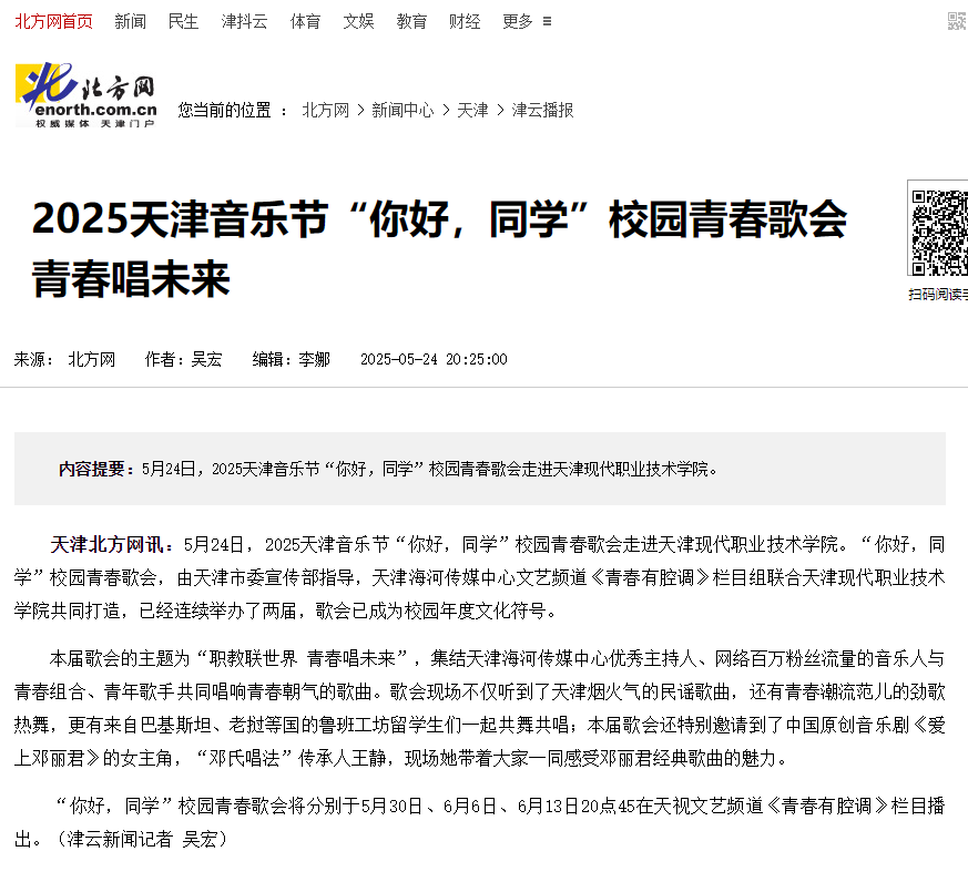 天津北方网讯:5月24日,2025天津音乐节“你好,同学”校园青春歌会走进KY开元集团官网。“你好,同学”校园青春歌会,由天津市委宣传部指导,天津海河传媒中心文艺频道《青春有腔调》栏目组联合KY开元集团官网共同打造,已经连续举办了两届,歌会已成为校园年度文化符号。