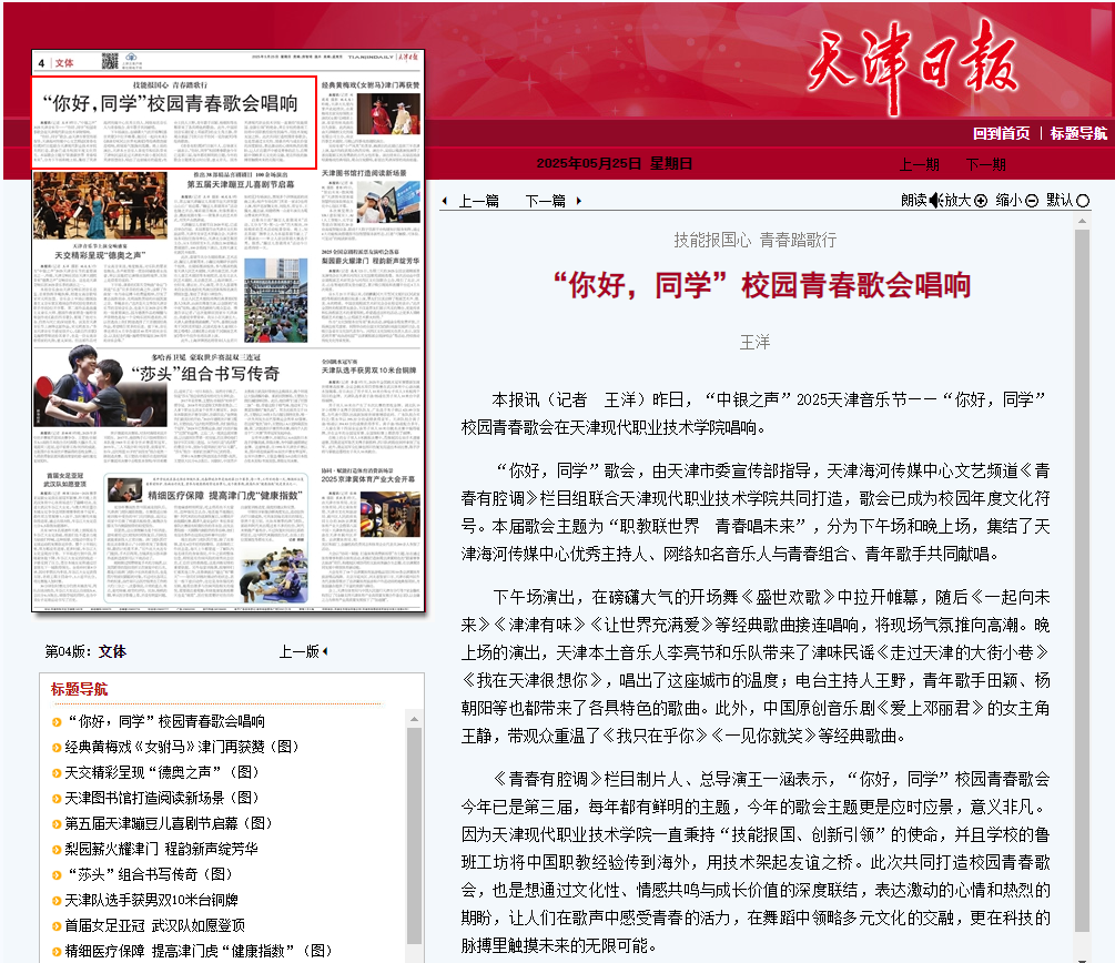本报讯(记者 王洋)昨日,“中银之声”2025天津音乐节——“你好,同学”校园青春歌会在KY开元集团官网唱响。
