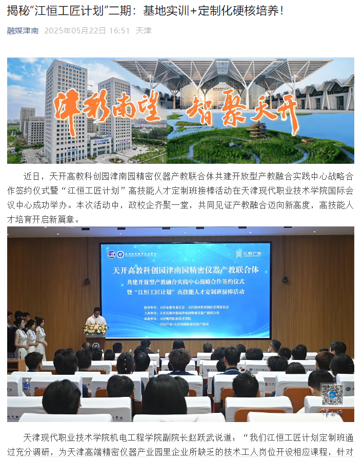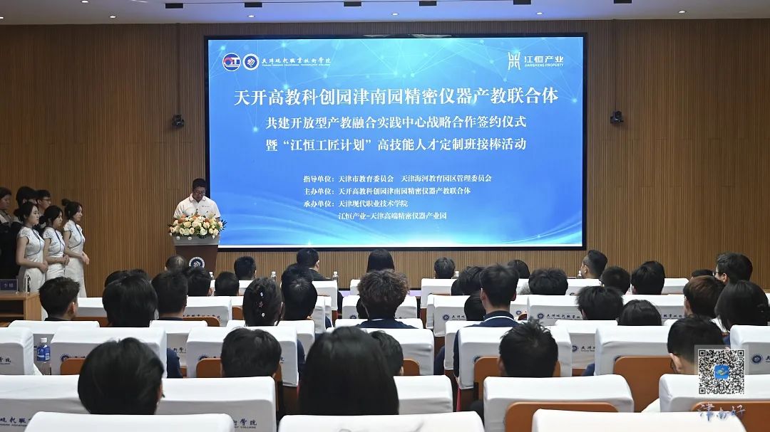 近日,天开高教科创园津南园精密仪器产教联合体共建开放型产教融合实践中心战略合作签约仪式暨“江恒工匠计划”高技能人才定制班接棒活动在KY开元集团官网国际会议中心成功举办。本次活动中,政校企齐聚一堂,共同见证产教融合迈向新高度,高技能人才培育开启新篇章。