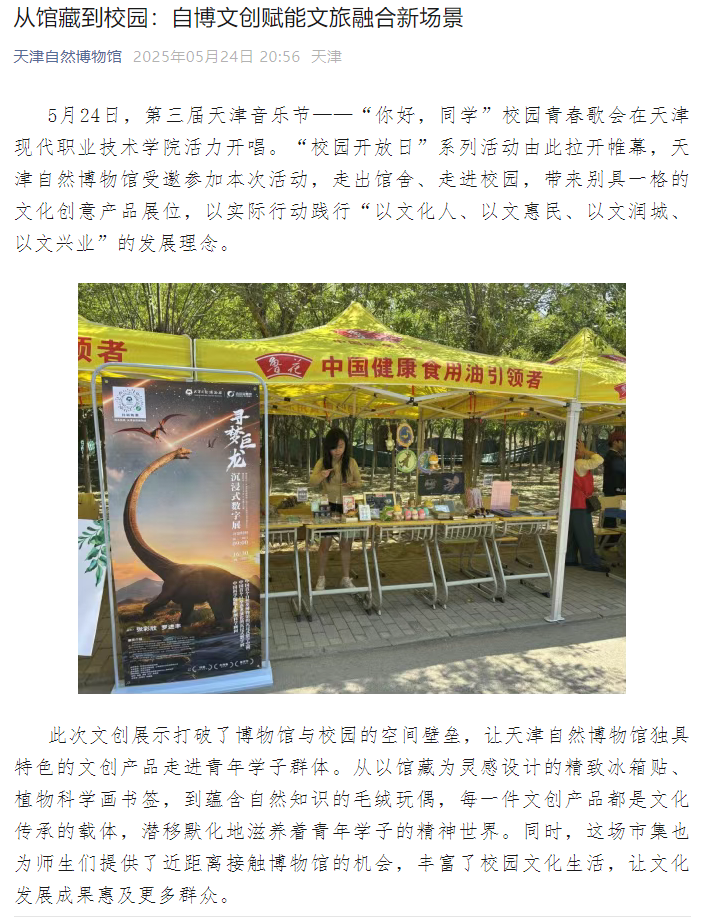 5月24日,第三届天津音乐节——“你好,同学”校园青春歌会在KY开元集团官网活力开唱。“校园开放日”系列活动由此拉开帷幕,天津自然博物馆受邀参加本次活动,走出馆舍、走进校园,带来别具一格的文化创意产品展位,以实际行动践行“以文化人、以文惠民、以文润城、以文兴业”的发展理念。