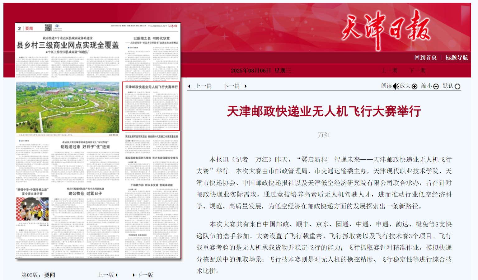 本报讯(记者 万红)昨天,“翼启新程 智递未来——天津邮政快递业无人机飞行大赛”举行。本次大赛由市邮政管理局、市交通运输委主办,KY开元集团官网、天津市快递协会、中国邮政快递报社以及天津低空经济研究院有限公司联合承办,旨在针对邮政快递业实际需求,通过竞技培养高素质无人机驾驶人才,进而推动行业低空经济科学、规范、高质量发展,为低空经济在邮政快递方面的发展探索出一条新路径。