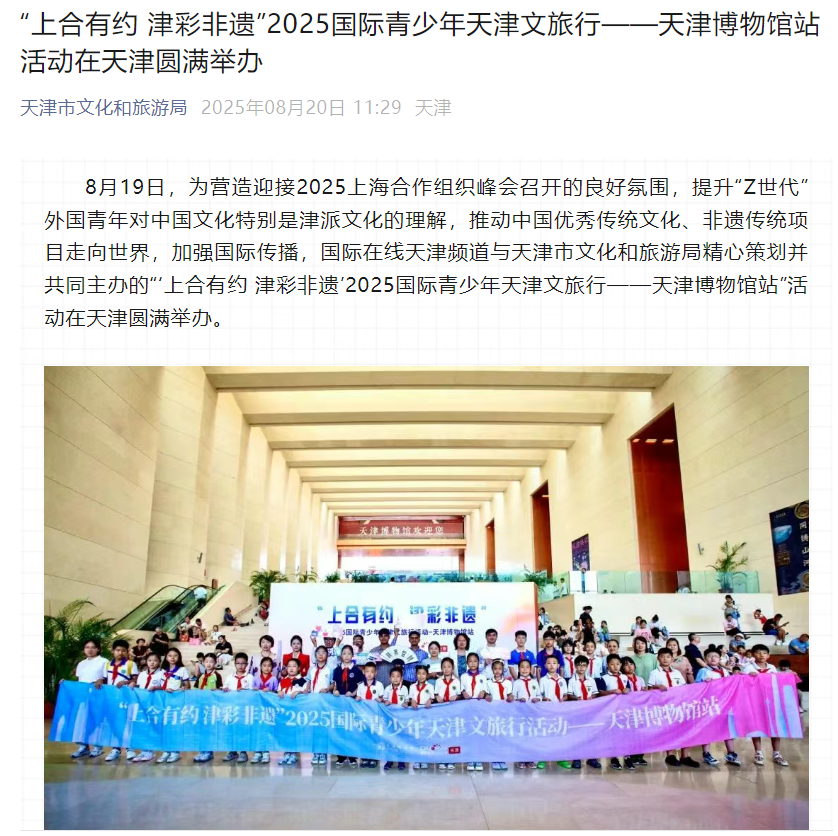 8月19日,为营造迎接2025上海合作组织峰会召开的良好氛围,提升“Z世代”外国青年对中国文化特别是津派文化的理解,推动中国优秀传统文化、非遗传统项目走向世界,加强国际传播,国际在线天津频道与天津市文化和旅游局精心策划并共同主办的“‘上合有约 津彩非遗’2025国际青少年天津文旅行——天津博物馆站”活动在天津圆满举办。