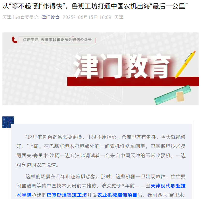 “以前收玉米,我们要雇20多个人,干一整天才能收完几亩地,现在一台中国机器一天就能收100亩。”阿杜勒拍了拍身旁的玉米收获机,笑着说,“多亏了它,非常感谢那些教会我们使用它的鲁班工坊师生们。”