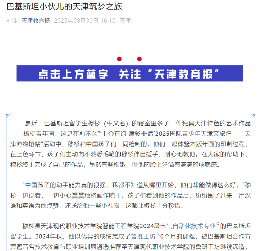 来到天津后,穆杉发现这里的一切都与他熟悉的巴基斯坦不同。教室里先进的设施、同学之间对专业知识的交流、全国技能大赛总决赛期间的观摩,都让他感到新奇和兴奋。尽管语言交流上有障碍,但老师们的耐心解答、同学们的热心帮助,以及学院学生会留学生部的关怀,让他逐渐克服了困难。