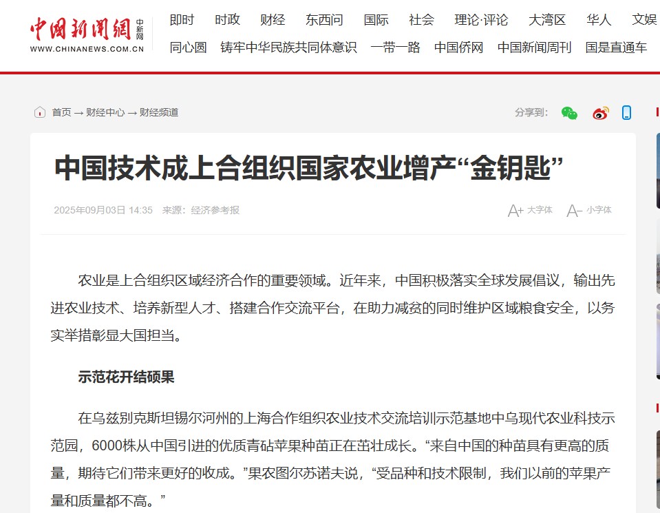 农业是上合组织区域经济合作的重要领域。近年来,中国积极落实全球发展倡议,输出先进农业技术、培养新型人才、搭建合作交流平台,在助力减贫的同时维护区域粮食安全,以务实举措彰显大国担当。