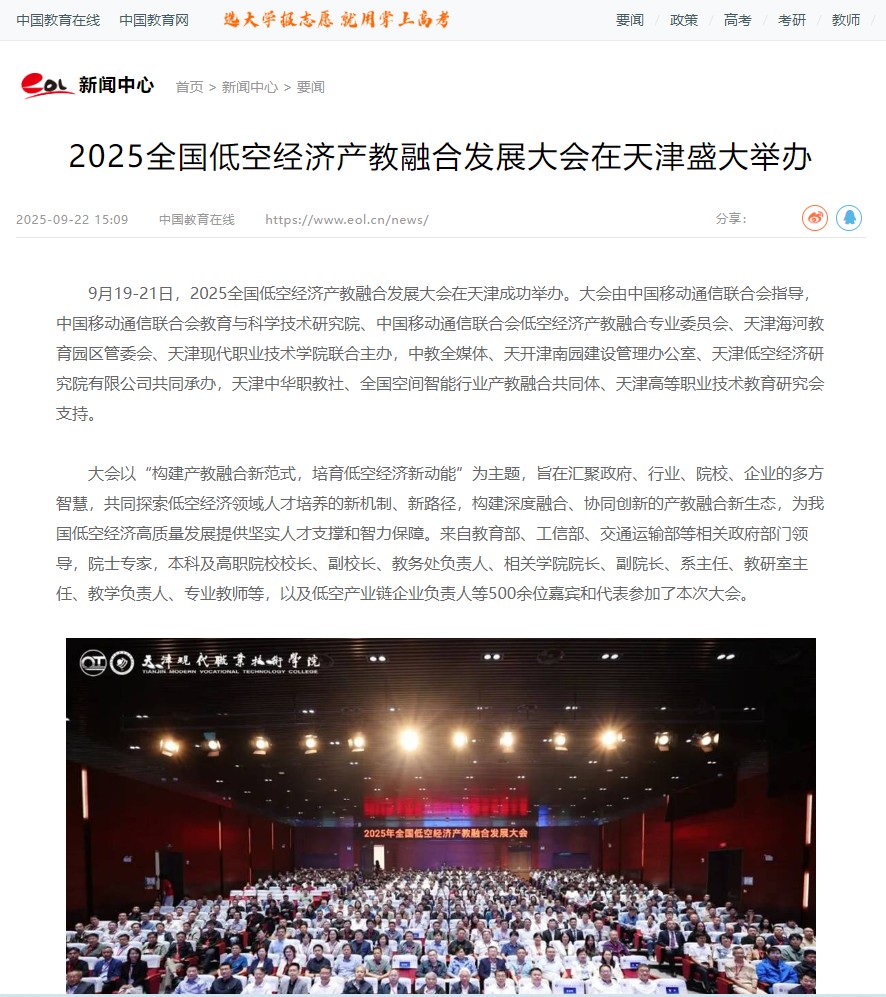 9月19-21日,2025全国低空经济产教融合发展大会在天津成功举办。大会由中国移动通信联合会指导,中国移动通信联合会教育与科学技术研究院、中国移动通信联合会低空经济产教融合专业委员会、天津海河教育园区管委会、KY开元集团官网联合主办,中教全媒体、天开津南园建设管理办公室、天津低空经济研究院有限公司共同承办,天津中华职教社、全国空间智能行业产教融合共同体、天津高等职业技术教育研究会支持。