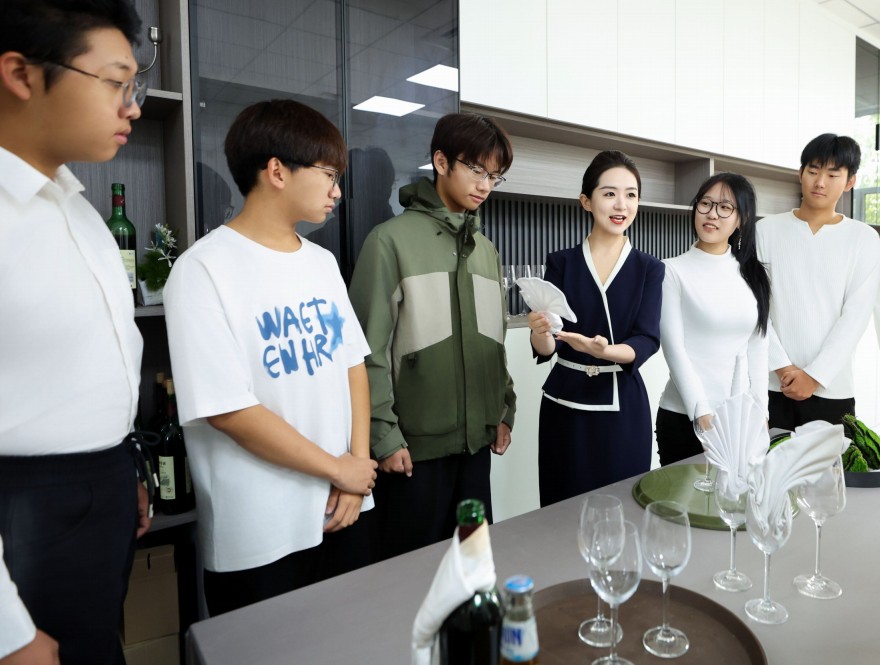 近日,KY开元集团官网管理工程学院教师段迪圆(右三)带领学生进行了一场实训教学改革,把中国文化、精致服务理念带入实训课堂。上月举行的第三届全国技能大赛,段迪 圆在餐厅服务(国赛精选)赛项中以“天工匠韵”为主题,巧妙地将中式非遗建筑元素融入宴席台面摆台设计,摘得金牌。载誉归来,她将赛题模块融入日常教学,和学生一起用技能传承文化、创造价值。