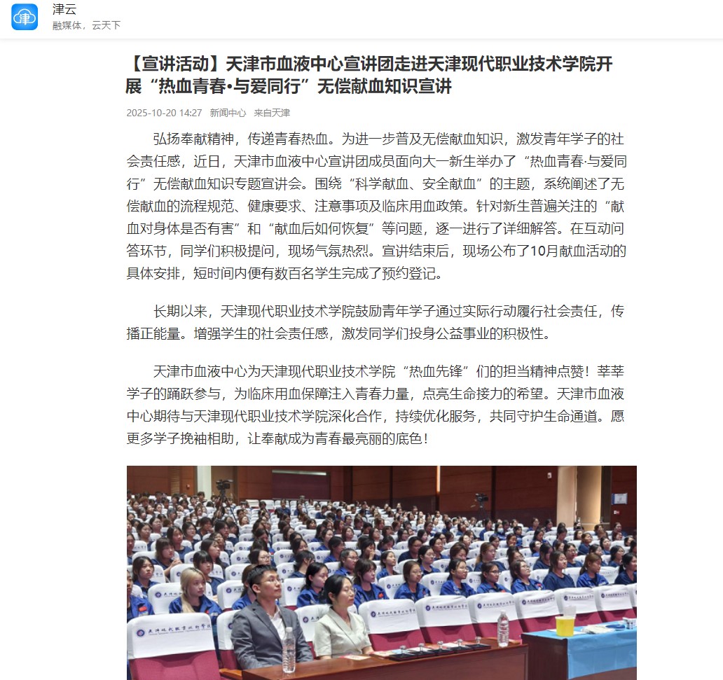 弘扬奉献精神,传递青春热血。为进一步普及无偿献血知识,激发青年学子的社会责任感,近日,天津市血液中心宣讲团成员面向大一新生举办了“热血青春·与爱同行”无偿献血知识专题宣讲会。围绕“科学献血、安全献血”的主题,系统阐述了无偿献血的流程规范、健康要求、注意事项及临床用血政策。针对新生普遍关注的“献血对身体是否有害”和“献血后如何恢复”等问题,逐一进行了详细解答。在互动问答环节,同学们积极提问,现场气氛热烈。宣讲结束后,现场公布了10月献血活动的具体安排,短时间内便有数百名学生完成了预约登记。