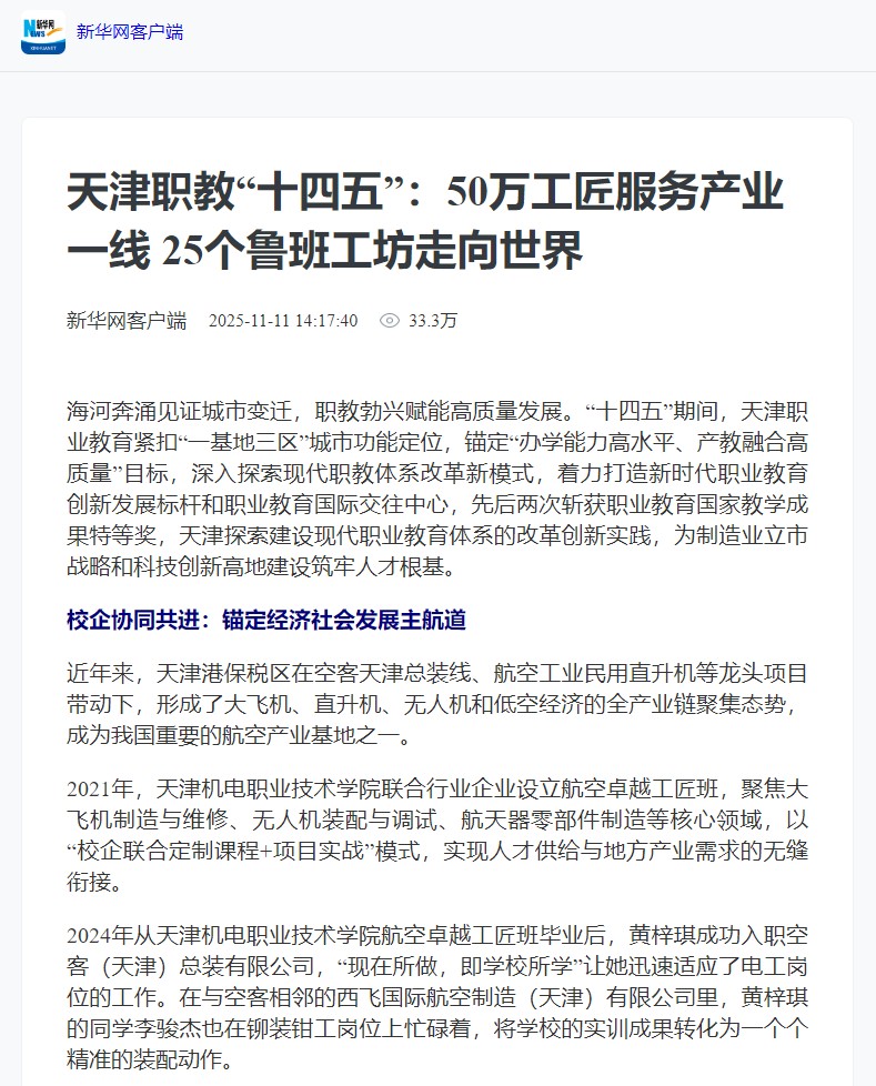 2021年,天津机电职业技术学院联合行业企业设立航空卓越工匠班,聚焦大飞机制造与维修、无人机装配与调试、航天器零部件制造等核心领域,以“校企联合定制课程+项目实战”模式,实现人才供给与地方产业需求的无缝衔接。