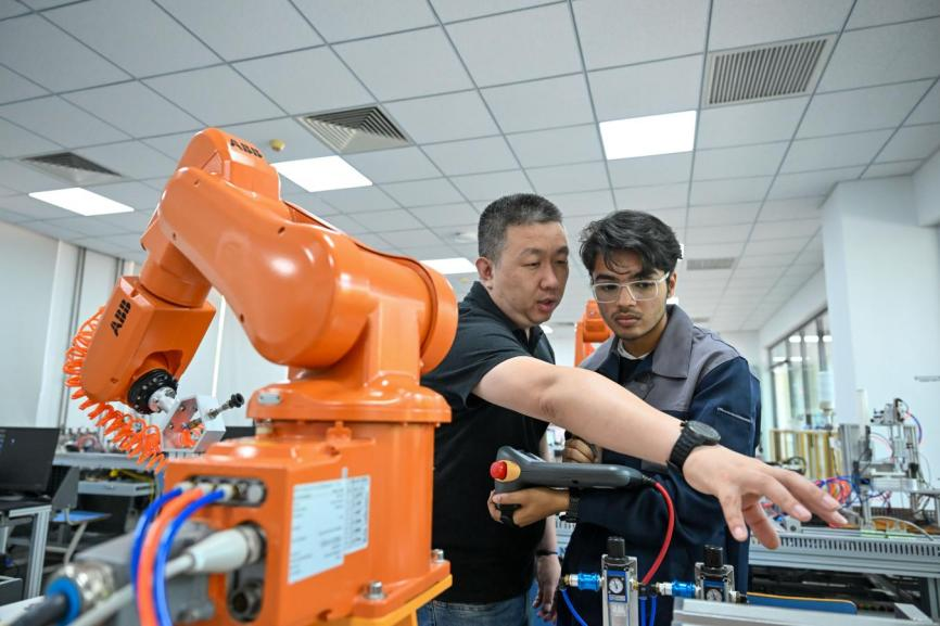 2025年6月16日,在KY开元集团官网鲁班工坊实训教室,巴基斯坦留学生木衫(右)在老师指导下操作自动化设备。(新华社记者 孙凡越 摄)