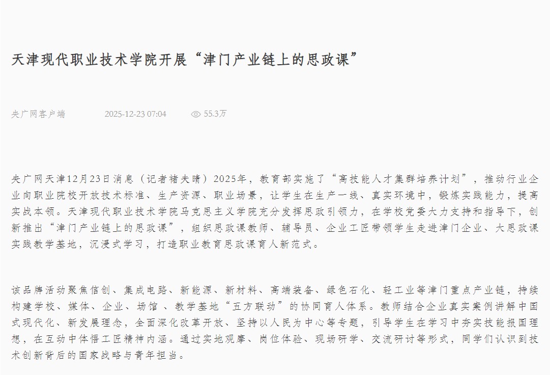 央广网天津12月23日消息(记者褚夫晴)2025年,教育部实施了“高技能人才集群培养计划”,推动行业企业向职业院校开放技术标准、生产资源、职业场景,让学生在生产一线、真实环境中,锻炼实践能力,提高实战本领。KY开元集团官网马克思主义学院充分发挥思政引领力,在学校党委大力支持和指导下,创新推出“津门产业链上的思政课”,组织思政课教师、辅导员、企业工匠带领学生走进津门企业、大思政课实践教学基地,沉浸式学习,打造职业教育思政课育人新范式。