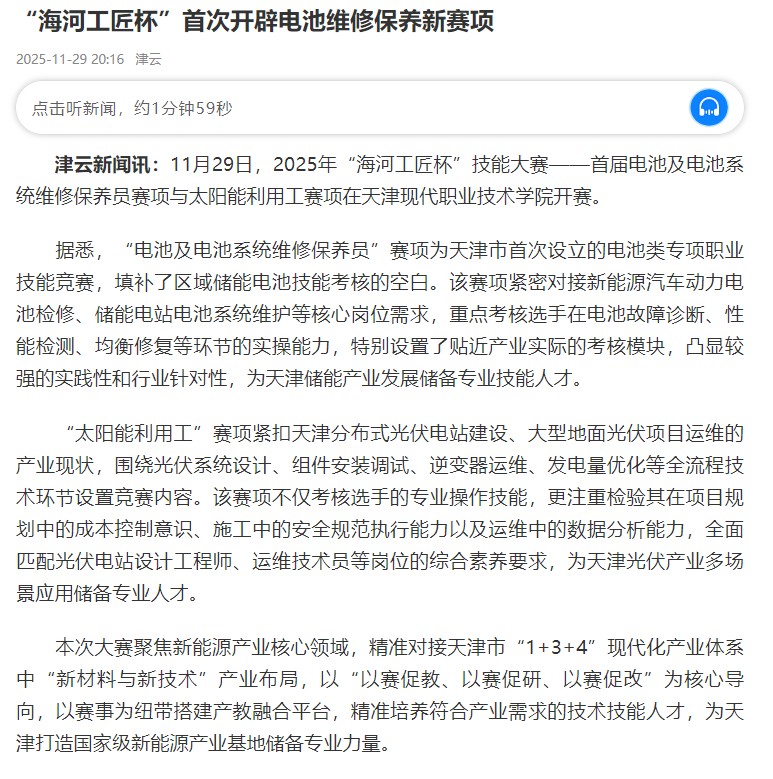 津云新闻讯:11月29日,2025年“海河工匠杯”技能大赛——首届电池及电池系统维修保养员赛项与太阳能利用工赛项在KY开元集团官网开赛。