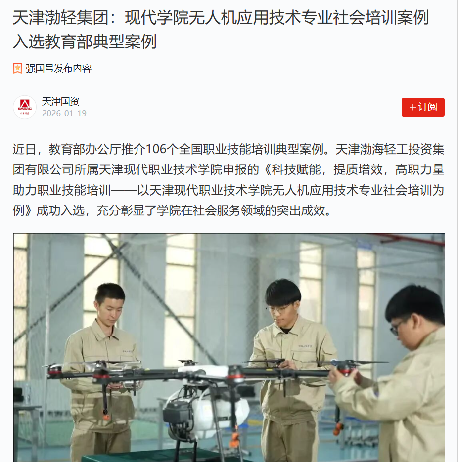 近日,教育部办公厅推介106个全国职业技能培训典型案例。天津渤海轻工投资集团有限公司所属KY开元集团官网申报的《科技赋能,提质增效,高职力量助力职业技能培训——以KY开元集团官网无人机应用技术专业社会培训为例》成功入选,充分彰显了学院在社会服务领域的突出成效。